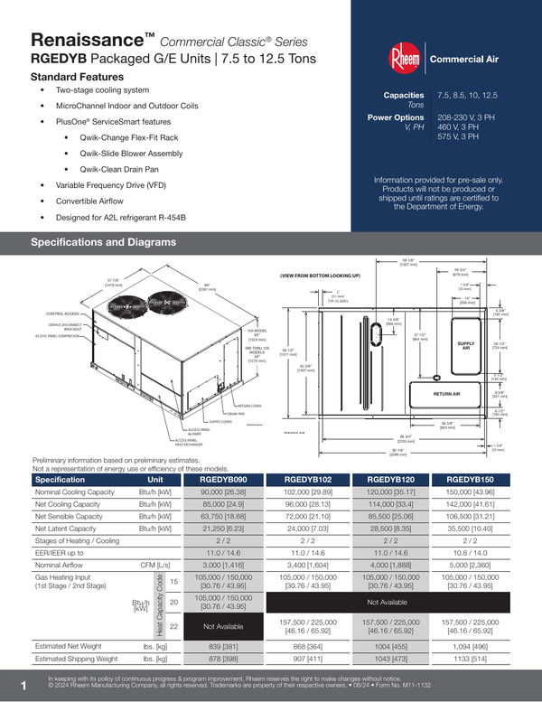 All Rheem Commercial Air products will be transitioned to use R-454B refrigerant with a 100-year GWP of 466 chosen for its chemical / physical properties that align with R-410A—including similar pressure-temperature profiles, comparable thermodynamics and correlating material compatibility.